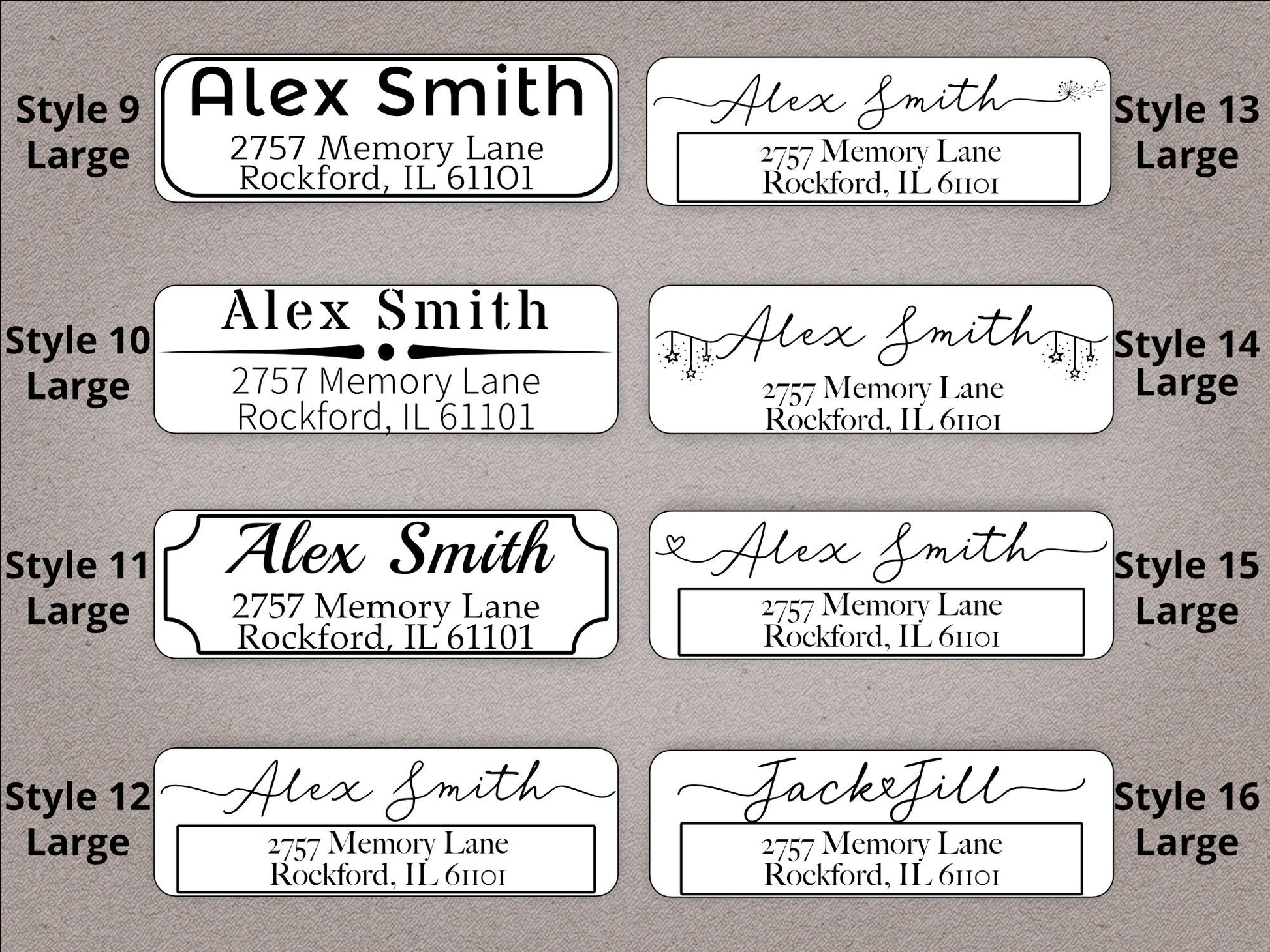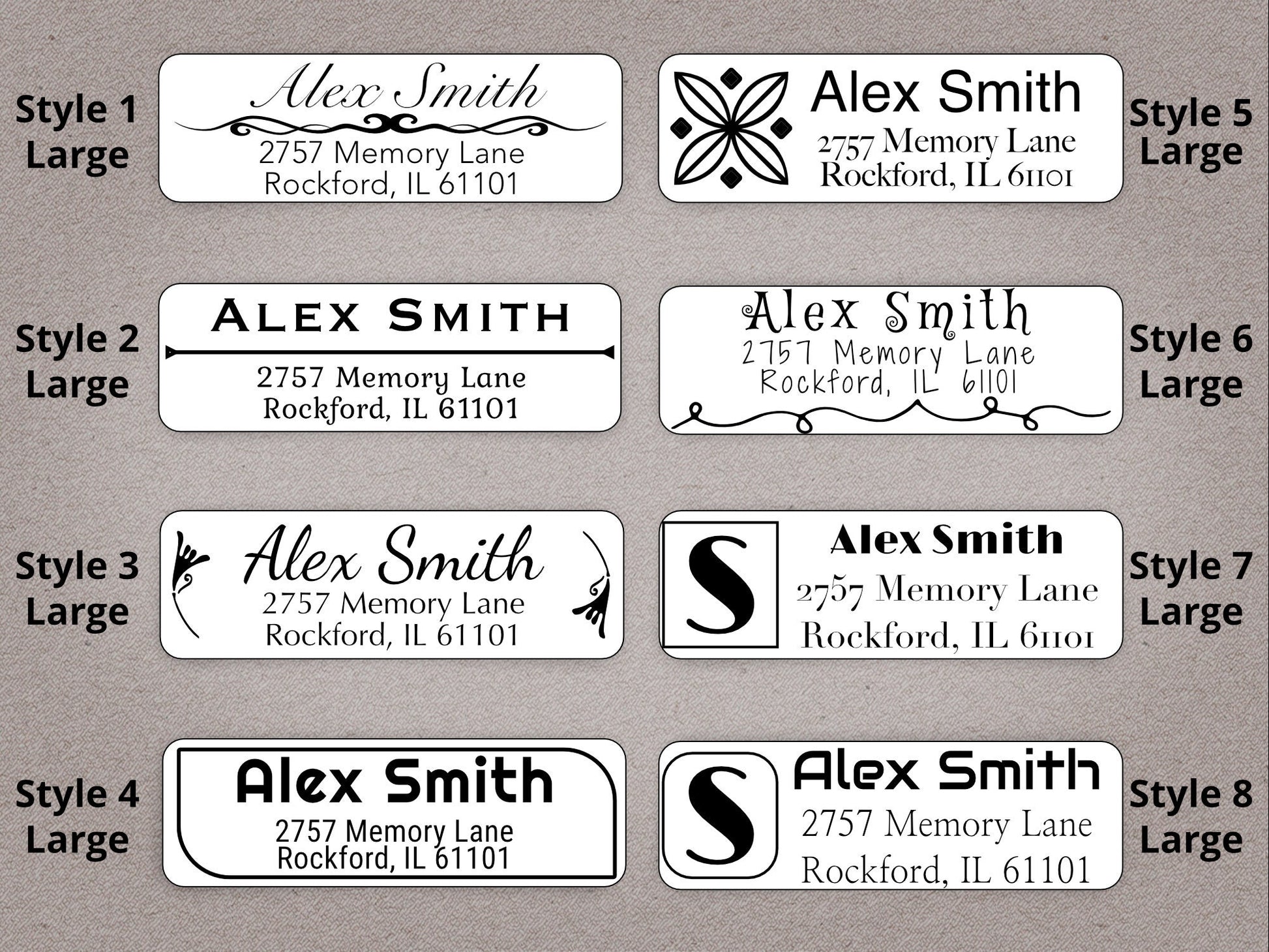 Simple and elegant large return address labels. Select from 16 unique designs available in 2 sizes. Thermally printed on a roll with up to 500 labels per roll.
